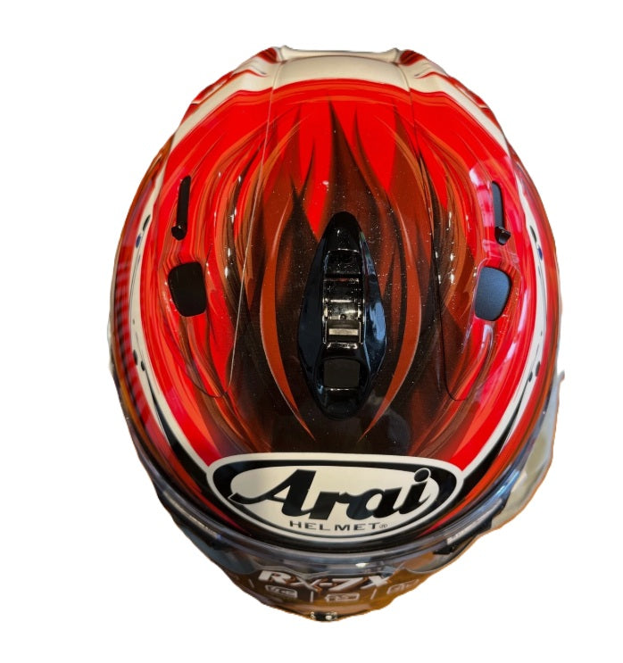 Arai RX-7 EVO Trata-se da evolução do Arai RX-7 V e os esforços dos engenheiros de Arai concentraram-se em melhorar a aplicação do conceito R75 Shape. O conceito R75 Shape consiste em oferecer uma calota externa (estrutura externa), mais resistente, mais arredondada e mais suave. A correcta aplicação deste conceito traduz-se, em termos de segurança, em uma maior capacidade de dispersão de energia em caso de impacto.